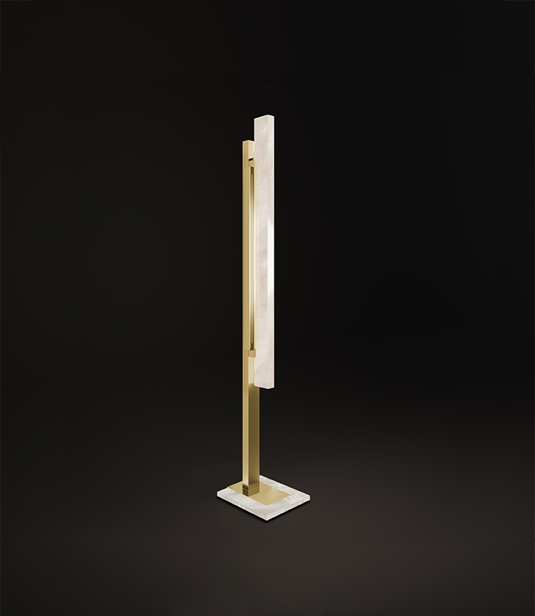 The Skyline Floor Lamp redefines floor lighting by drawing inspiration from the towering silhouette of skyscrapers. Its design, characterized by a unique and minimalist aesthetic, features alabaster and gold-plated brass, making it a versatile addition that harmonizes with any interior décor.