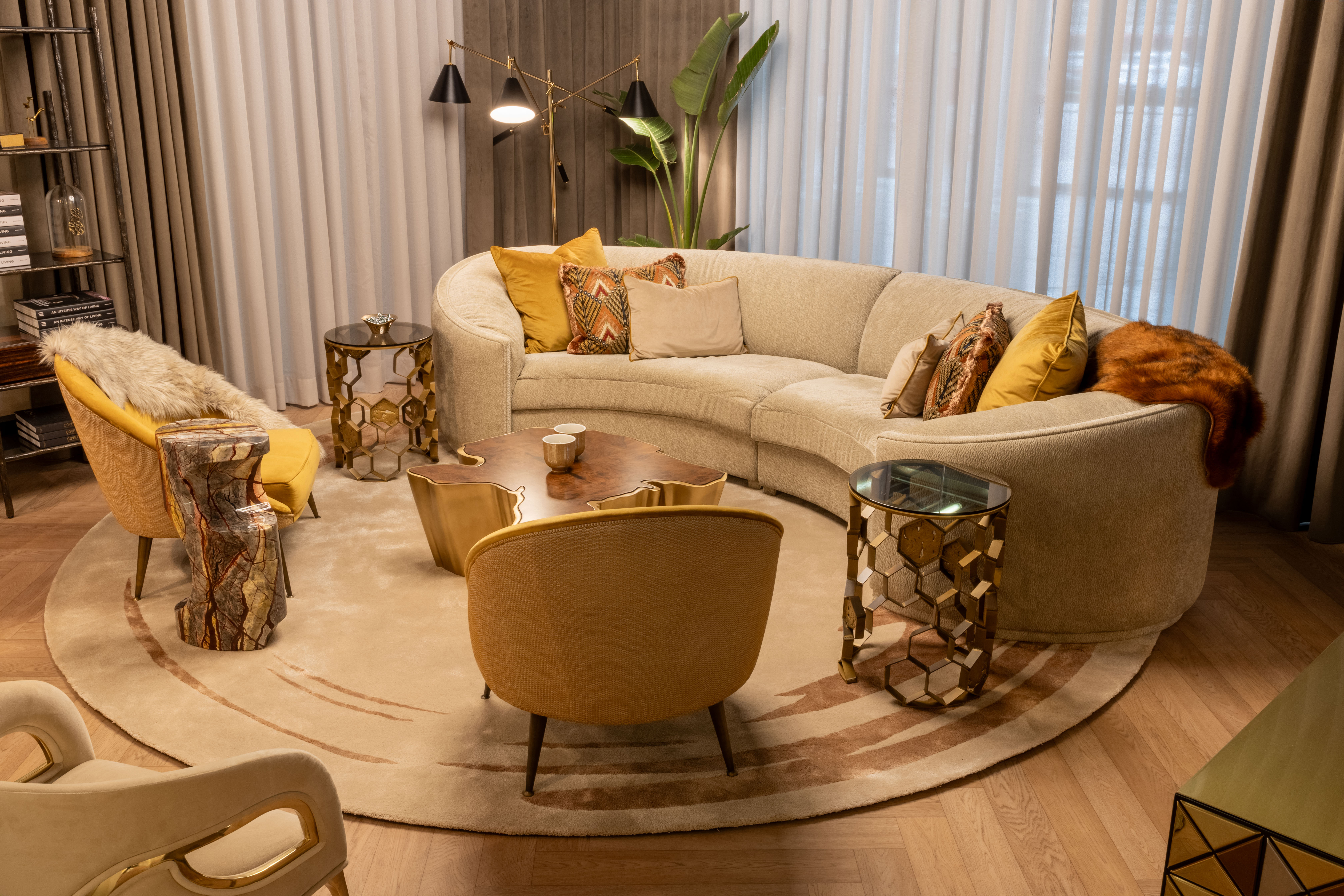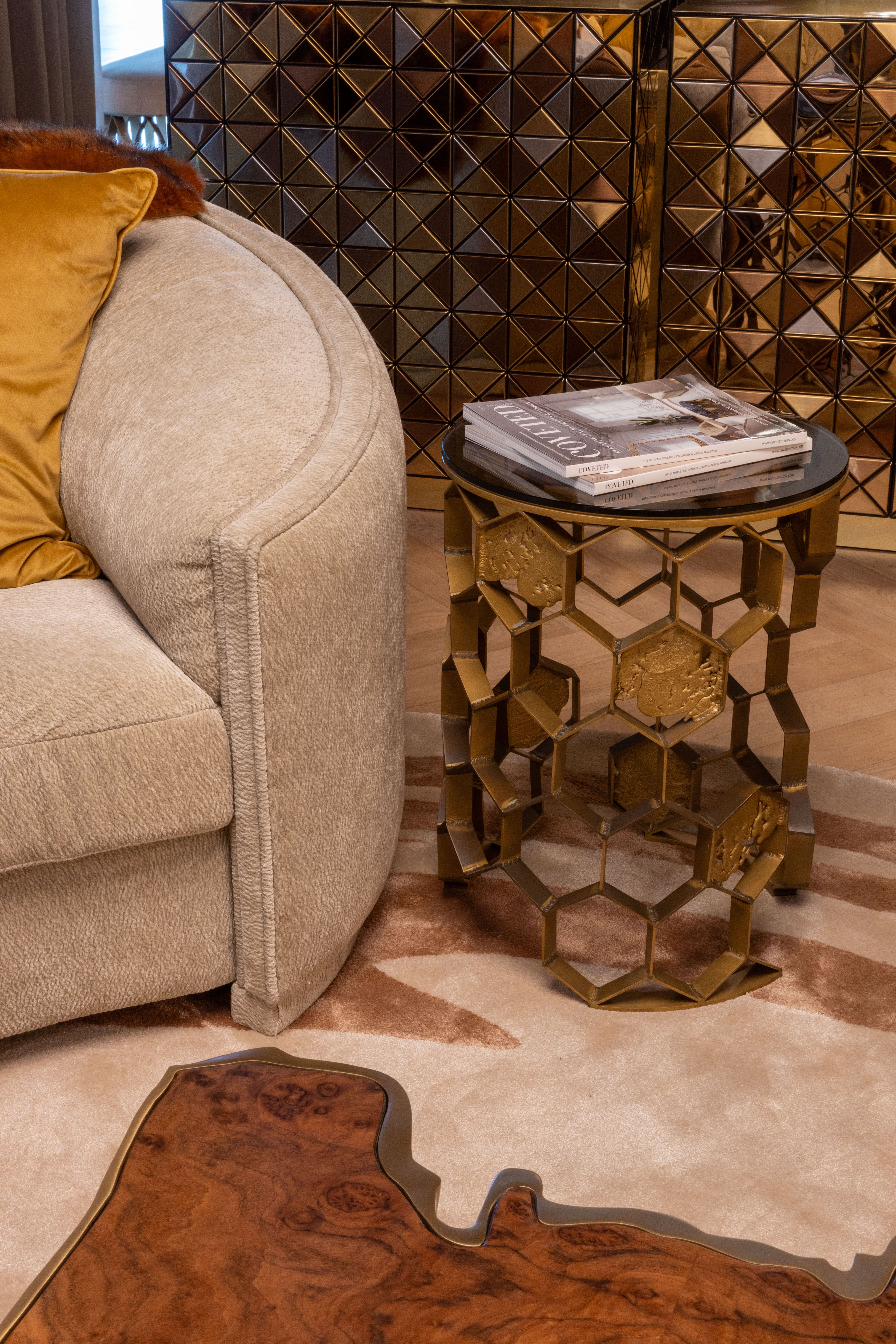 Step into a world of refined design with a curated selection of iconic pieces from renowned luxury brands. The Uzu Round Rug by Rug’Society anchors the space with its hypnotic pattern and bold presence. Surrounding it, the Manuka Side Table, Sequoia Center Table, Malay Armchair, Bryce Side Table, Mambu Bookcase, Cay Side Table, and the Wales Round Two Sofa by BRABBU bring an organic elegance and rich textures inspired by nature and cultural heritage. Adding a contemporary and artistic flair, Boca do Lobo's Pixel Anodized Sideboard becomes a statement piece with its vibrant color and pixelated design, complemented by the luxurious Chandra Chair and the radiant Hera Suspension Light, both blending bold aesthetics with meticulous craftsmanship. Finishing the ensemble, the iconic Sinatra Floor Lamp by Delightfull channels mid-century charm with a modern twist, casting a sophisticated glow across the room.